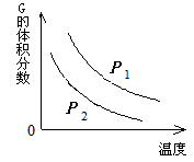 时,G的体积分数更大,而压强P1 < P2,即减小压强平衡向逆反应方向移动即逆反应方向为气体体积增大方向,得a>b;当压强相同时,随温度的升高G的体积分数减少,即升高温度平衡向正反应方向移动,即正反应方向为吸热反应;所以