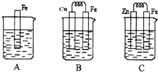 (3)C中锌作负极,锌失电子变成离子进入溶液,所以被腐蚀的是锌;A中铁和稀硫酸反应;B中铁作负极,加快铁的腐蚀;C中铁作正极,减慢铁的腐蚀.
