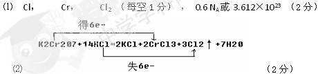 ⑴在K2Cr207+14HCl=2KCl+2CrCl3+3Cl2↑+7H20反应中, 元素被氧化, 元素发生还原反应; 是氧化产物;若0.1 mol K2Cr207完全反应,则被氧化的HCl的分子数目为