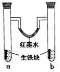 1、选择题 下图装置中,U型管内为红墨水,a,b试管内分别盛有食盐水和稀醋酸溶液,各加入生铁块,放置一段时间后,下列有关描述正确的是