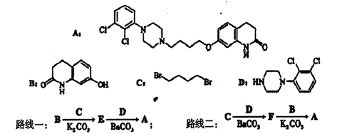 3、填空题 阿立哌唑(A)是一种新的抗精神分裂症药物,可由化合物B、C、D在有机溶剂中通过以下两条路线合成得到。