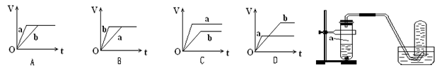 2、选择题 向足量的a、b两份锌粉中,分别加入少量且等量的稀H2SO4,同时向a中加入少量的CuSO4溶液。下图表示产生H2的体积(V)与时间(t)的关系,其中正确的是(?)