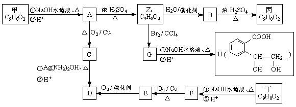 3、填空题 (15分) 芳香族化合物甲、乙、丙、丁互为同分异构体,其分子式为C9H8O2,有关的转化关系如下图所示。已知:甲、乙、丁分子中无甲基,0.1 mol D与足量的NaHCO3反应,生成标准状况下的气体4.48 L。