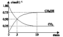 CH3OH(g) + H2O(g) ΔH=-49.0 kJ·mol-1。一定条件下,向体积为1 L的密闭容器中充入1 mol CO2和3 mol H2,测得CO2和CH3OH(g)的浓度随时间变化曲线如下图所示。下列叙述中,正确的是