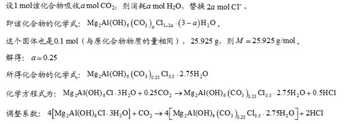 (4)“部分氯离子会被碳酸根离子代替”,由化合价守恒或称电荷守恒,2个氯离子取代一个碳酸根离子。设被替换的Cl2x mol,则CO32- x mol。发现:消耗Cl0.132 mol,而26.65 g固体本身只有0.1 mol,即固体中只有0.1 mol Cl ,明显不符合题意。也就是说就算Cl全部转化为碳酸根,都无法得到25.925 g固体。设1 mol该化合物吸收a mol CO2,则消耗a mol H2O,替换2a mol Cl 。即该化合物的化学式: