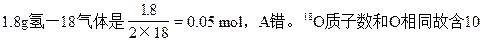 个中子,H原子无中子,一个H218O分子有10个中子,1mol H218O中有10 mol中子即6.02×1024个中子,B错。