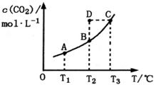 1、选择题 在恒容密闭容器中存在下列平衡:CO(g)+H2O(g)CO2(g)+H2(g)。CO2的平衡物质的量浓度c(CO2)与温度T的关系如图所示。下列说法错误的是(?)