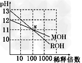 D、稀释前MOH溶液和ROH溶液中由水电离出的c(OH-)? 后者是前者的?10倍?