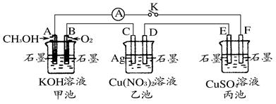 本题解析:(1)甲、乙、丙三池中只有甲池中的氧化还原反应能自发进行,因此甲池为原电池。(2)丙池中F电极与甲池负极相连,为阴极,丙池为电解硫酸铜溶液,总反应式为2CuSO4+2H2O