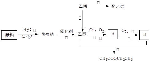 1、填空题 (14分)现以淀粉或乙烯为主要原料都可以合成乙酸乙酯,其合成路线如图所示。
