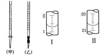 (4)0.2000mol·L-1的盐酸应装在下图所示的??(填甲、乙)中,图Ⅰ所示为滴定前液面,图Ⅱ所示为滴定结束时液面,根据图示计算被测烧碱溶液的物质的量浓度是?mol·L-1。