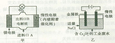 ,正确;B、电解池中阴离子向阳极移动,所以图乙中Cr2O72-金属铁电极移动,错误;C、图乙电解池阳极反应为Fe—2e?=Fe2+,阴极反应为2H++2e?=H2↑所以若有0.084 g阳极材料参与反应,则阴极产生氢气的体积为:0.084g÷56g/mol×22.4L/mol=0.0336L=33.6ml,错误;D、图甲燃料电池消耗3.6 g镁时,失去的电子式0.3mol,图乙中阳极反应为:Fe—2e?=Fe2+,根据电子守恒,生成的Fe2+为0.15mol,所以最后生成的Fe(OH)3也是0.15mol,质量为16.05g,错误。