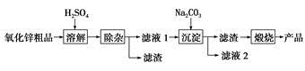 3、填空题 2013年1月27日百度新闻资讯中报道,活性氧化锌是一种多功能性的新型无机材料,其颗粒大小约在1~100纳米。云南化工冶金研究所采用湿化学法(NPP-法)制备纳米级活性氧化锌,可用各种含锌物料为原料,采用酸浸出锌,经过多次净化除去原料中的杂质,然后沉淀获得碱式碳酸锌,最后焙解获得活性氧化锌,化学工艺流程如下:
