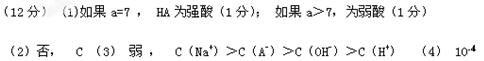 3、填空题 (12分)常温下,将某一元酸HA和NaOH溶液等体积混合,两种溶液的浓度和混合后所得溶液的pH如下表: