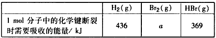 5、选择题 已知H2(g) +Br2(l)=2HBr(g);△H=-72kJ/mol。蒸发1 mol Br2(l)需要吸收的能量为30 kJ,其他相关数据如下表