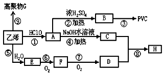 2、填空题 工业上用乙烯和氯气为原料合成聚氯乙烯(PVC)。已知次氯酸能跟乙烯发生加成反应:CH2=CH2+HOCl→CH2(OH)CH2Cl。以乙烯为原料制取PVC等产品的转化关系如下图所示。