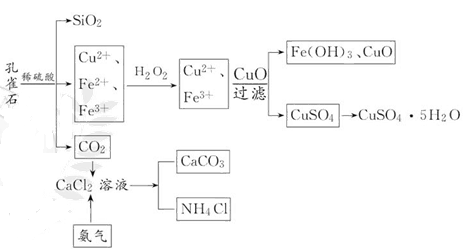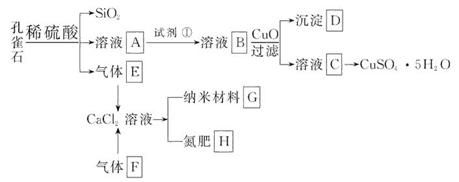 5、填空题 孔雀石主要含Cu2(OH)2CO3,还含少量Fe、Si的化合物。以孔雀石为原料可制备CuSO4·5H2O及纳米材料G,步骤如下:
