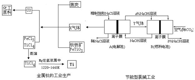 5、填空题 (15分)氯碱工业是高耗能产业,为了提高原料的利用率,将电解的Y气体作为燃料电池燃料,为电解池供电;X气体作为钛的冶炼原料,在这种工艺设计中,相关物料的传输与转化关系如下图所示,其中氯碱工业装置中的电极未标出,所用的离子膜都只允许阳离子通过。如下图所示: