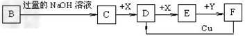 3、推断题 已知B是一种由三种短周期(各位于不同周期)元素组成的正盐,该盐在常用锌锰干电池中做电解质;Y在常温下为液态,E的相对分子质量比D大16,它们存在如下转化关系(反应条件及部分产物已略去)