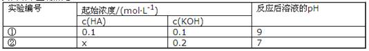 本题解析:根据表中①的数据说明HA为弱酸,由此说明表中②的X>0.2;实验①反应后恰好生成KA,少量A-发生水解,则该溶液中c(K+)>c(A-)>c(OH-)>c(H+),A项正确;据电荷守恒在该溶液中各离子浓度的关系式为c(K+)+c(H+)=c(A-)+c(OH-),则c(OH-)=c(K+)+c(H+)-c(A-),B项错误;实验②反应后的溶液中除了有KA,还有过量的HA,再据电荷守恒得:c(K+)=c(A-)>c(OH-)=c(H+),D项正确;由于X>0.2,当一元酸HA的溶液和KOH溶液等体积混合,据物料守恒得c(A-)+c(HA)>0.1mol·L-l,C项正确。