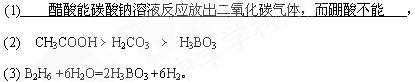 1、填空题 向两支分别盛有0.1mol/L醋酸和饱和硼酸(H3BO3)溶液的试管中滴加等浓度碳酸钠溶液,实验现象为(1)?三种酸由强到弱的顺序是(用化学式表示)(2)?,]硼酸(H3BO3)在食品、医药领域应用广泛。
