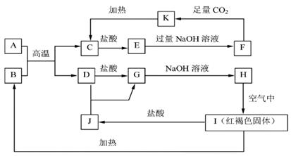 3、填空题 (10分)下已知A~K均为中学化学中的常见物质,它们之间的转化关系如下图所示,其中A、D为金属单质,反应过程中生成的水及其他部分产物已略去。