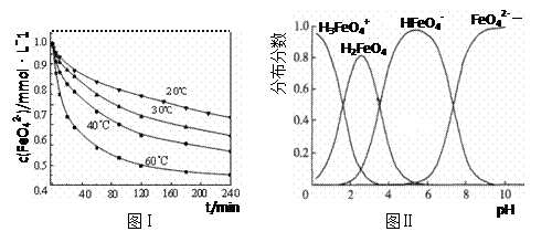 (3)将适量K2FeO4配制成c(FeO42-) =1.0 mmol·L-1的试样,将试样分别置于20℃、30℃、40℃和60℃的恒温水浴中,测定c(FeO42-)的变化,结果见图Ⅰ。第(1)题中的反应为FeO42-变化的主反应,则温度对该反应的反应速率和平衡移动的影响是??;发生反应的△H ??0(填“>”、“<”或“=”)。
