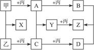 2、填空题 已知甲、乙、丙为常见单质,A、B、C、D、X、Y、Z为常见化合物,Y的相对分子质量比Z小16,乙与丙的相对分子质量相同,B的相对分子质量比D的小2,B与X的相对分子质量相同,各物质转化关系如右图(各反应条件已略去)。