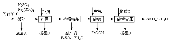 3、填空题 工业上用闪锌矿(主要成分为ZnS,还含有Fe2O3等杂质)为原料生产ZnSO4·7H2O的工艺流程如下: