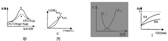 A.图甲中a、b曲线分别表示反应CH2=CH2 (g) + H2(g)→CH3CH3(g);ΔH< 0使用和未使用催化剂时,反应过程中的能量变化