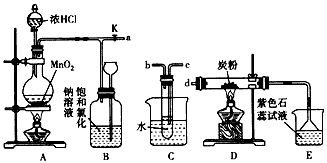 (3)实验开始先点燃A处的酒精灯,打开旋塞K,让Cl2充满整个装置,再点燃D处的酒精灯。Cl2通过C装置后进入D,D装置内盛有炭粉,发生氧化还原反应,生成CO2和HCl(g),装置C的作用是_____________;为了使C装置发挥更好的作用,可向烧杯中加入浓硫酸,加入浓硫酸的作用是______________