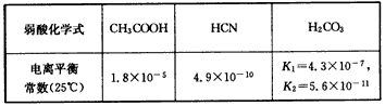 2、选择题 已知25℃时有关弱酸的电离平衡常数