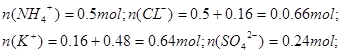 2、选择题 在无土栽培液中,每升溶液需用0.5 mol NH4Cl溶液、0.16 mol KCl溶液、0.24molK2SO4溶质作为培养液,若用KCl、NH4Cl和(NH4)2SO4三种物质来配制1.00L上述营养液,所需三种盐的物质的量是?(?)