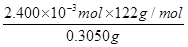)= 0.1000mol/L×24.00×10-3L=2.400×10-3 mol;而配制溶液用的是测定的4倍,即测定含样品0.3050g,所以,样品中苯甲酸纯度为