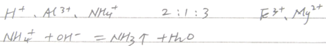 本题解析:由图,开始加入NaOH溶液,无沉淀生成则溶液中含有H+,再加入NaOH溶液有沉淀生成则溶液中可能有Mg2+、Fe3+、Al3+、,再加入NaOH溶液,沉淀不变化则溶液中有NH4+,再加入NaOH溶液,沉淀溶解最后消失则溶液中有Al3+无Mg2+、Fe3+;根溶液呈电中性的原则,可得H+,Al3+,NH4+,的物质的量之比为2:1:3;