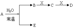 5、填空题 (9分)下图是元素周期表的一部分,A、B、C、D、E、X是周期表给出元素组成的常见单质或化合物。
