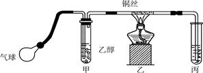 3、实验题 某课外活动小组利用如下图所示的装置进行乙醇的催化氧化实验并制取乙醛(试管丙中用水吸收产物),图中铁架台等固定装置已略去。实验时,先加热玻璃管中的铜丝,约1 min后鼓入空气。请填写下列空白: