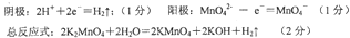 由题意在阳极上得到KMnO4,在阴极上得到KOH,阴极是水的电离平衡被破坏,阴极:2H2O?+2e―=H2+2OH― ;阳极:MnO42――e―=MnO42―