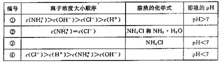 (2) ①中因c(NH4+)最大,所以溶质为NH3·H2O和NH4Cl;②中由电荷守恒可得溶液pH=7;③中由NH4Cl水解可得离子浓度关系;④中c(Cl-)最大,因此溶质为HCl 和 NH4Cl。