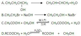 本题解析:A中乙烯与溴水反应是加成反应,A不符合,B都是取代反应,C中淀粉水解是水解反应,醛的氧化与还原都是氧化或还原反应,C不符合,D中纤维素水解是水解反应,浓硫酸和乙醇在170℃时的反应为消去,D不符合。