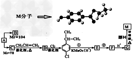 1、推断题 某相对分子质量为26的烃A,是一种重要的有机化工原料,以A为原料在不同的反应条件下可以转化为烃B、烃C。B、C的核磁共振氢谱显示都只有一种氢,B分子中碳碳键的键长有两种。以C为原料通过下列方案可以制备具有光谱高效食品防腐作用的有机物M,M分子的球棍模型如下图所示。