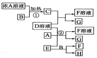 1、填空题 Ⅰ.有关物质存在如图所示的转化关系(部分产物已省略)。通常B为黑色粉末,C为气体单质,G为紫黑色固体单质。实验室中,常用固体E在B的催化下加热制取气体单质H。