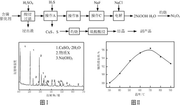 (1)根据图Ⅰ所示的X射线衍射图谱,可知浸出渣含有三种主要成分,其中“物质X”为?。图Ⅱ表示镍的浸出率与温度的关系,当浸出温度高于70℃时,镍的浸出率降低,浸出渣中Ni(OH)2含 量增大,其原因是?。