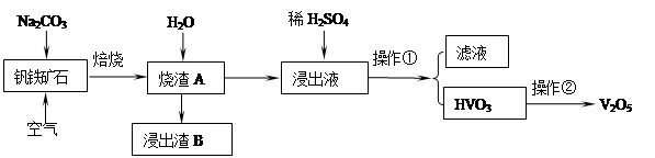 本题解析:(1)依题意,焙烧时不仅发生反应:V2O5+Al2O3+2Na2CO3?=2NaVO3+2NaAlO2+2CO2↑,而且FeO被空气中的氧气氧化为氧化铁(或四氧化三铁或既有氧化铁又有四氧化三铁),因为+2价的铁元素在高温下易被氧化;由于加入的碳酸钠过量,则氧化铝、五氧化二钒全部转化为可溶性的钠盐,加入足量水浸取时,铁的氧化物难溶于水,则浸出渣B的主要成分是Fe2O3或Fe3O4,或者Fe2O3和Fe3O4;(2)由已知信息②可知,H2SO4与NaVO3反应生成难溶的HVO3,HVO3包裹在一些烧渣的表面,阻碍了反应的进行,从而降低了HVO3产率,且使产生的HVO3不纯;另外,铁的氧化物会和硫酸反应生成铁离子,增加干扰离子,消耗硫酸,浪费资源,因此不采取硫酸浸取烧渣;(3)由于HVO3的溶解度很小,HVO3难溶于水,从浸出液中分离难溶物的方法是过滤、洗涤,由此确定操作①的方法;如果不洗涤,HVO3吸附了可溶性的硫酸钠、硫酸铝典礼处的钠离子和铝离子;HVO3是难溶性酸,与硅酸类似,受热可以分解,加热固体物质只能在坩埚中进行实验,因此选D;(4)五氧化二钒与NaOH溶液反应生成钒酸钠和水,不涉及氧化还原反应,说明五氧化二钒具有酸性氧化物的性质,氧化物应保留化学式,则该反应为V2O5?+2OH-?=?2VO3-+ H2O;