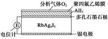 1、选择题 固体电解质是具有与强电解质水溶液的导电性相当的一类无机固体。这类固体通过其中的离子迁移进行电荷传递,因此又称为固体离子导体。目前固体电解质在制造全固态电池及其他传感器、探测器等方面的应用日益广泛。如RbAg4I5晶体,其中迁移的物种全是Ag+,室温导电率达0.27 Ω-1·cm-1。利用RbAg4I5晶体,可以制成电化学气敏传感器。下图是一种测定O2含量的气体传感器示意图,被分析的O2可以透过聚四氟乙烯薄膜,由电池电动势变化可以得知O2的含量。在气体传感器工作过程中,下列变化肯定没有发生的是?