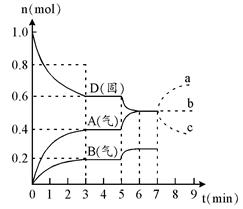 (3)第5分钟时,升高温度,A、B、D的物质的量变化如右图,则该反应是?(填“放热”或“吸热”)反应。若在第7分钟时增加D的物质的量,A的物质的量变化正确的是_____(用图中a~c的编号回答)