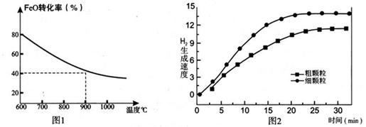 下列坐标图分别表示FeO的转化率(图1)和一定温度时,H2生成速率[细颗粒(直径0.25 mm),粗颗粒(直径3 mm)](图2)。