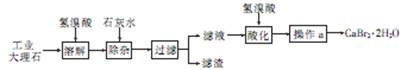 | D | 向蔗糖中加入浓硫酸 | 变黑,放热,体积膨胀,放出刺激性气体 | 浓硫酸具有吸水性和强氧化性, 反应中生成C、SO2和CO2等 参考答案:B 本题解析:A项AgNO3等产生同样现象,故A错;C项中甲苯使溴水褪色是萃取;向蔗糖中加入浓硫酸变黑,体现浓硫酸的脱水性,D错。 本题难度:一般 4、选择题  有 Al2(SO4)3 ,FeSO4,CuCl2, NaOH四种溶液,将其两两反应,若有一种溶液滴入另两种溶液中均产生了白色沉淀,继续滴加该溶液,原白色沉淀或消失或发生颜色变化,则可推断这一种溶液是?(?) 参考答案:D 本题解析:若有一种溶液滴入另两种溶液中均产生了白色沉淀,继续滴加该溶液,原白色沉淀或消失或发生颜色变化,沉淀消失可知,该物质必为NaOH,将NaOH滴加到Al2(SO4)3溶液中先生成氢氧化铝沉淀,NaOH过量,氢氧化铝与氢氧化钠反应生成溶于水的偏铝酸钠溶液,故选D. 本题难度:一般 5、填空题  溴化钙(CaBr2·2H2O)是一种白色晶体,易溶于水,有很强的吸湿性,是光敏纸矿泉水和灭火剂的重要成分,在医药上用作治疗神经衰弱等的药物,也用作化学分析。用工业大理石(含有少量Al3+、Fe3+等杂质)制备溴化钙的主要流程如下 参考答案:(1)CaCO3+2H+=Ca2++CO2↑+H2O(2分) 本题解析:解无机化学工艺流程题要注意:①审题头,明确化工生产的目的②审流程结合题给信息明确每一步的原理、目的和操作③答题要注意规范,注意化学用语的书写要求及实验操作的文字叙述;(1)大理石的主要成分为碳酸钙,与氢溴酸反应生成溴化钙、水和二氧化碳,离子方程式为CaCO3+2H+=Ca2++CO2↑+H2O;(2)分析工业大理石的成分及流程图知,除杂的目的是除去Al3+和Fe3+,结合氢氧化铝为两性氢氧化物,溶于强酸强碱,控制溶液的pH约为8.0的目的是确保Al3+和Fe3+沉淀完全;防止Al(OH)3溶解;(3)滤液中含过量氢氧化钙,用氢溴酸酸化的目的是除去过量的Ca(OH)2;溶液中得晶体的操作为蒸发浓缩、冷却结晶、过滤等;(4)根据质量守恒定律知,n(CaBr2)= n(CaCO3)=0.02mol,溴化钙晶体(CaBr2·2H2O)的质量为4.72g,质量分数为4.72/5.00×100%=94.4%;(5)①用硝酸酸化的硝酸银溶液检验溴离子,实验现象为产生淡黄色浑浊,离子方程式为Br-+Ag+=AgBr↓,②用草酸钠溶液检验钙离子,现象为产生白色沉淀,离子方程式为Ca2++C2O42-=CaC2O4↓。 本题难度:困难 |