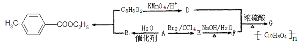 。A与水反应生成乙醇,因此A是乙烯。乙烯与溴发生加成反应生成E,即1,2-二溴乙烷,结构简式为BrCH2CH2Br。E水解生成F,则F是乙二醇,结构简式为HOCH2CH2OH。乙二醇与对苯二甲酸发生缩聚反应生成高分子化合物G,G的结构简式为