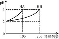 H++B-,故A错误;B、由图可知,稀释100倍时HA的pH变化大,且pH=4,所以HA为强酸,HB为弱酸,所以c(HB)>c(HA)=0.01mol/L,故B正确;C、NaA的水溶液显中性,离子浓度大小为c(Na+)=c(A-)>c(OH-)=c(H+),故C错误;D、由于不能确定NaA、NaB的物质的量,因此二者的混合溶液中:2c(Na+)=c(A-)+c(B-)+c(HB)不一定正确,故D错误,故选B。